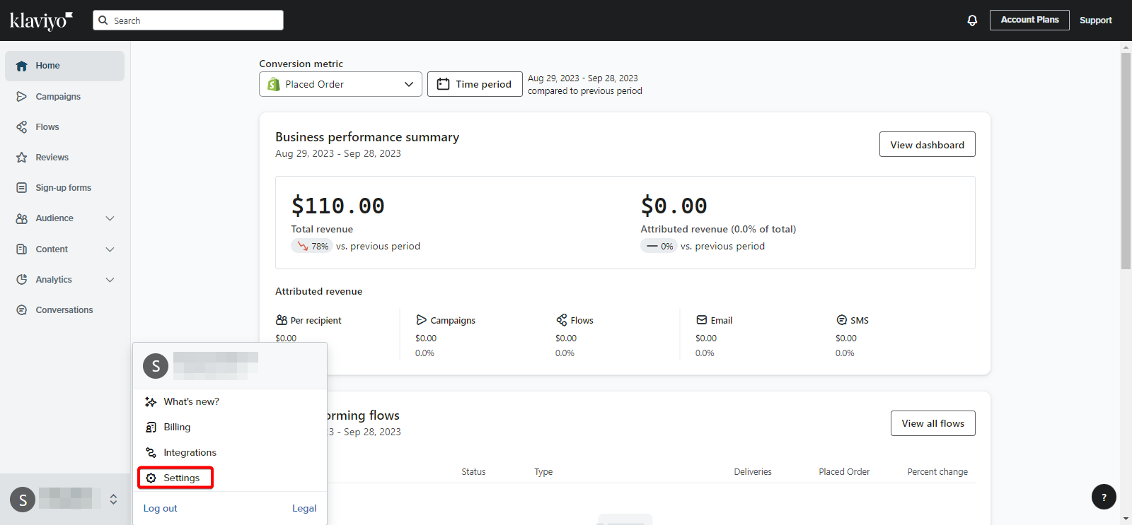 - From your Klaviyo Dashboard, select Settings under the Account section.