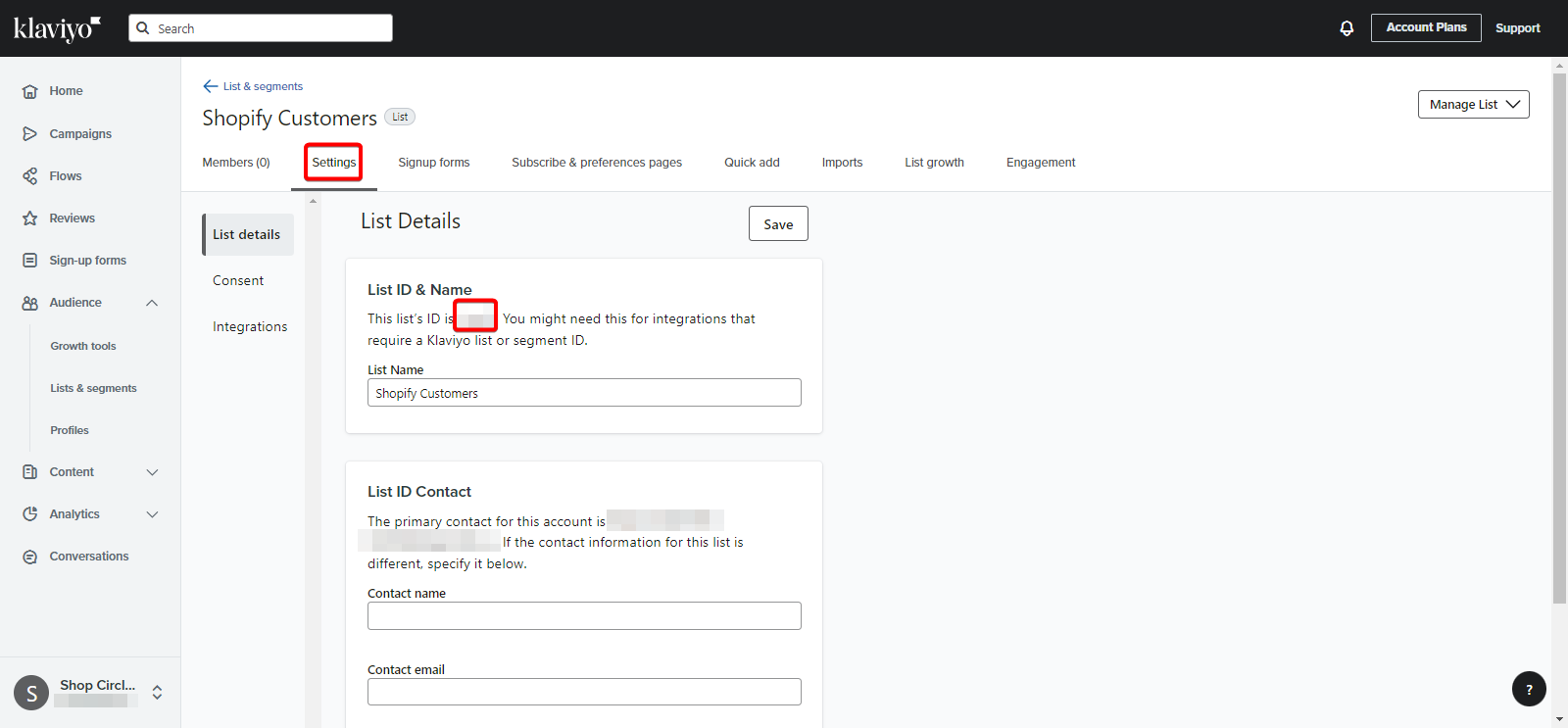 - Select Settings. On this page you will see the List ID. Take note of the ID.