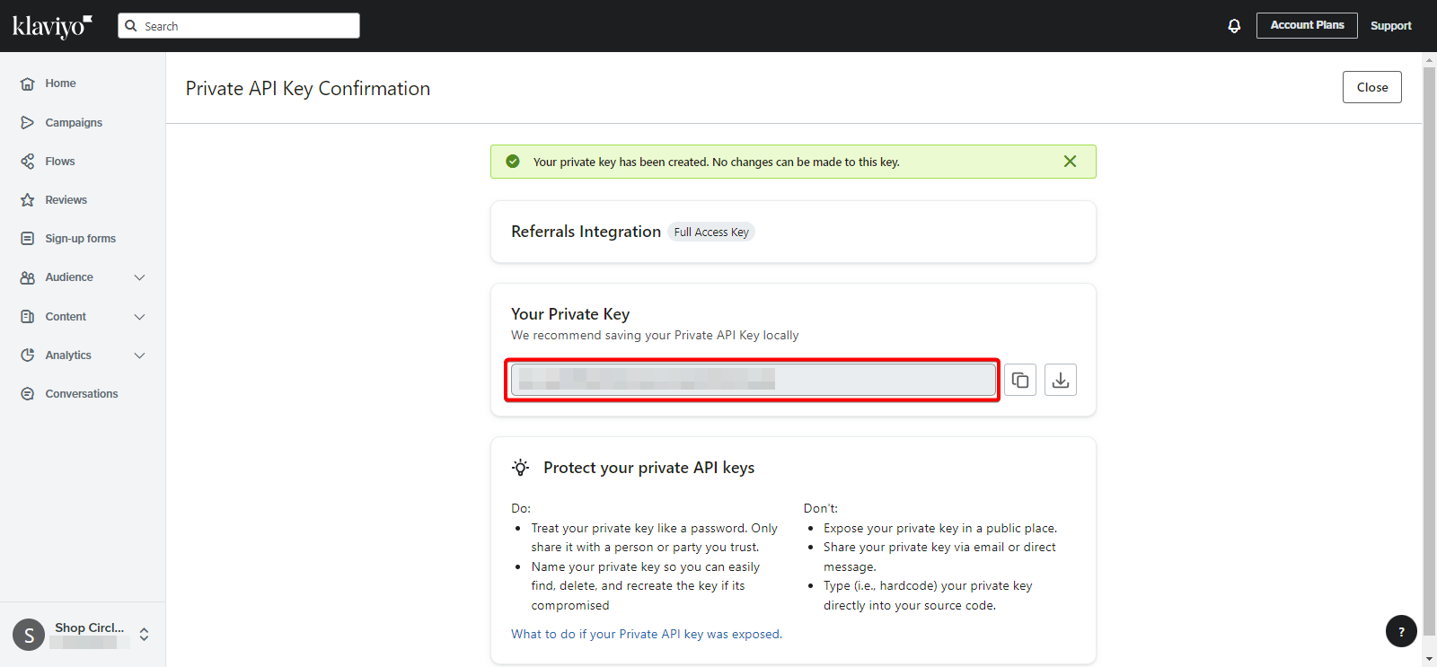 - Select Create and take note of the Private API key that comes up.