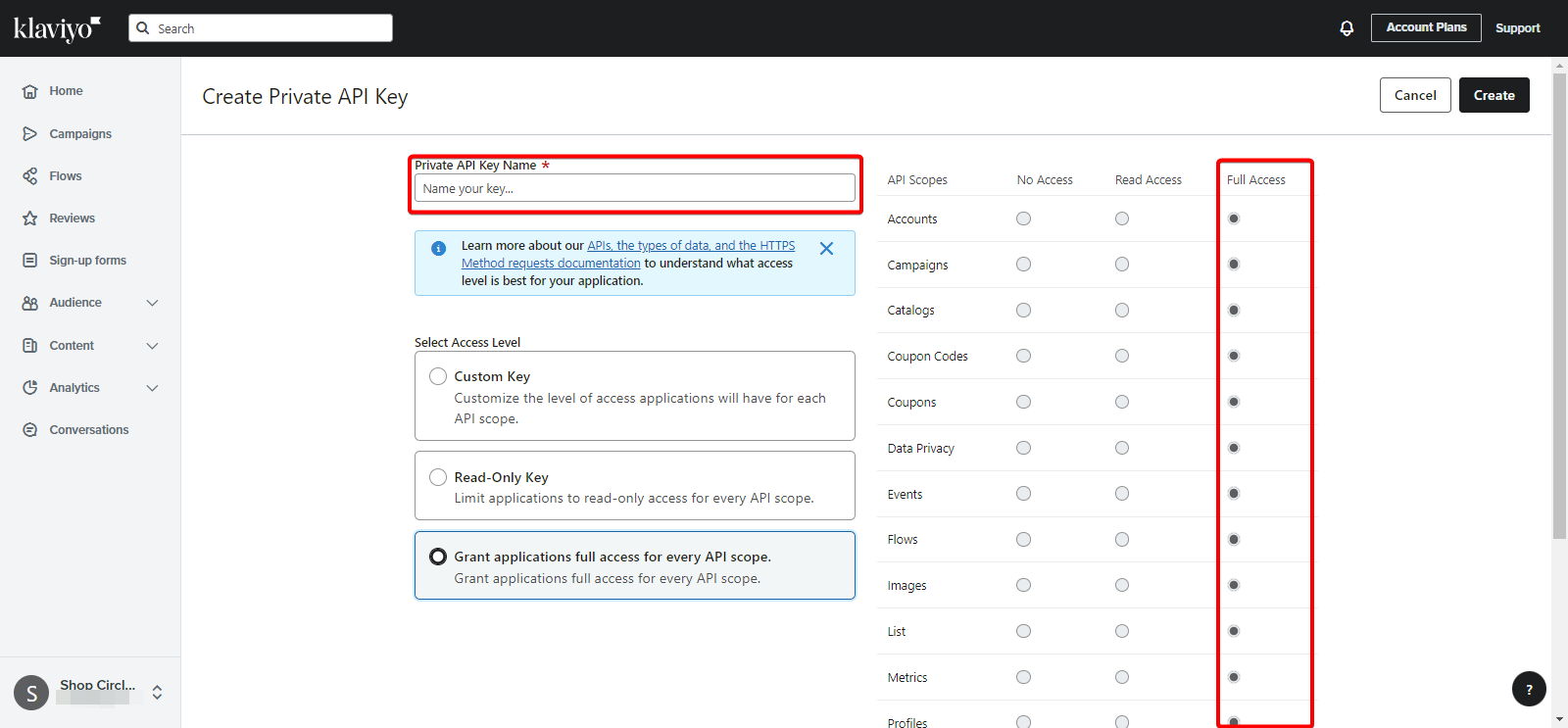 - Give your API Key a Names, and select which scopes you want to give access to (you can grant access to all scopes, or at minimum you need: List, Profiles, Subscriptions, Events). These scopes need to be Full Access.