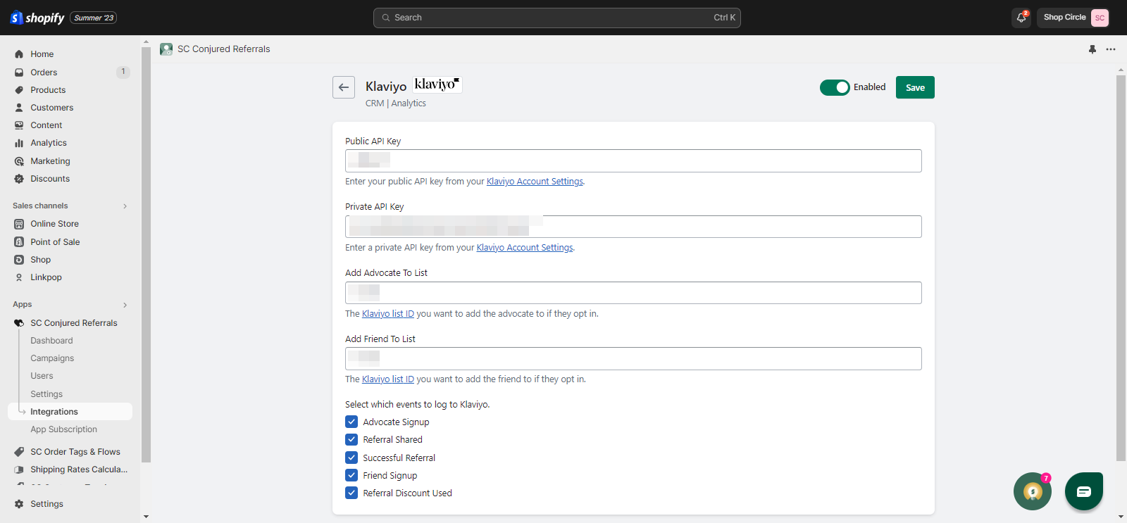 Klaviyo can be integrated with Conjured Referrals to allow you to add customers to your mailing lists and send out emails from your Klaviyo account instead of SC Conjured Referrals. This allows you to use Klaviyo to send emails to your customers who get added to those lists and also send the in-app communication through Klaviyo. The integration also allows you to track certain events associated with those customers. These events include the following: