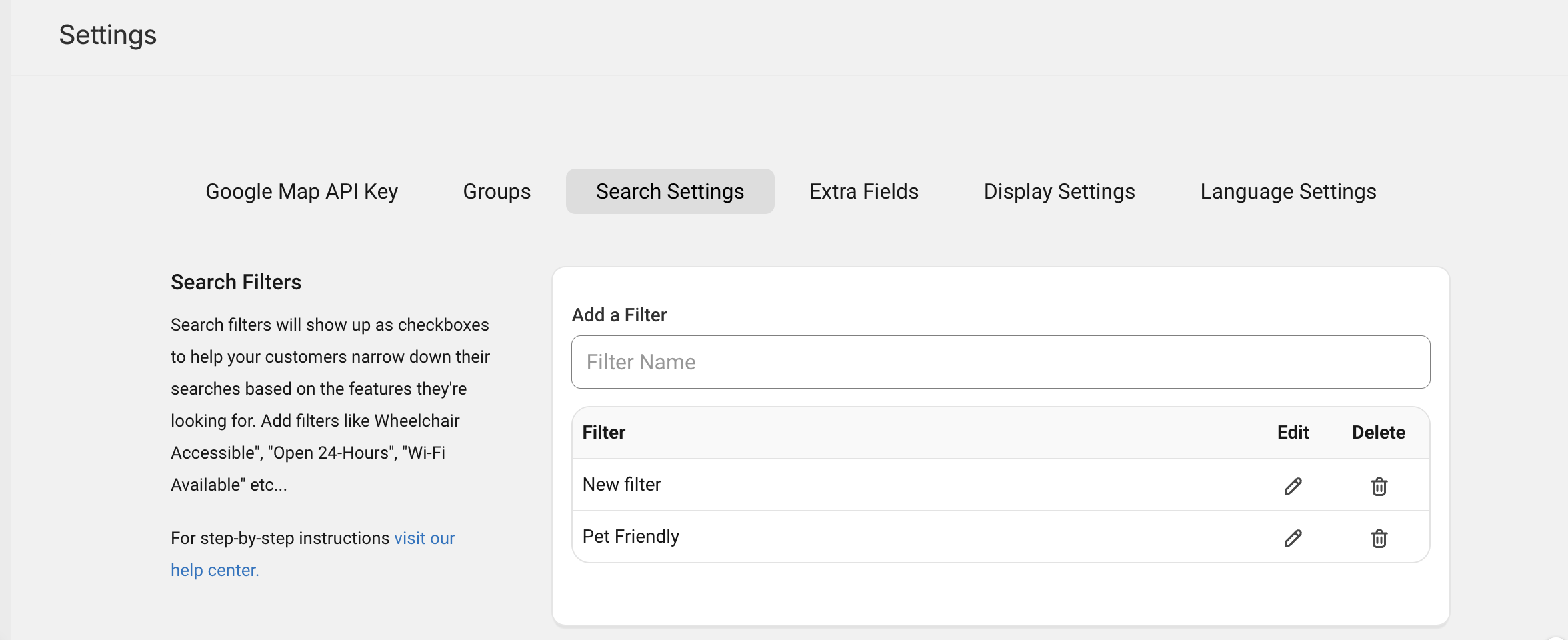 Store Locator allows you to create search filters to help your customers narrow down their searches. Search filters will show up as checkboxes on your map's page.