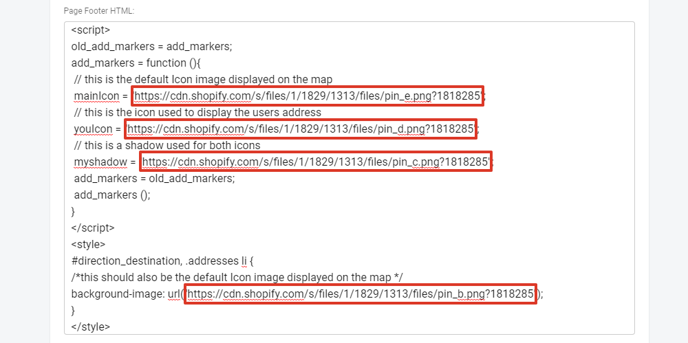 <script> old_add_markers = add_markers; add_markers = function (){ // this is the default Icon image displayed on the map mainIcon = "####"; // this is the icon used to display the users address youIcon = "!!!!"; // this is a shadow used for both icons myshadow = "****"; add_markers = old_add_markers; add_markers (); } </script> <style> #direction_destination, .addresses li { /*this should also be the default Icon image displayed on the map */ background-image: url("####"); } </style> - Replace ####, !!!!, and **** with the URLs to the images. Please ensure you leave the double quotation marks. ("") (from Step 5)