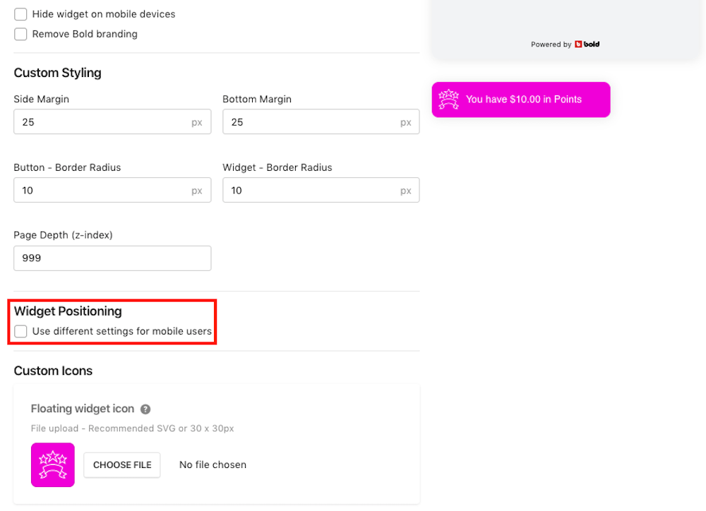 - Floating widget icon: This is what will appear at the top of your SC Loyalty Rewards widget, if you chose Icon for the logged in app bar greeting.