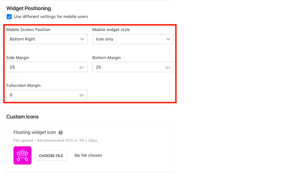 - Icon: This will display the floating widget icon that you have uploaded in the Custom Icons section.