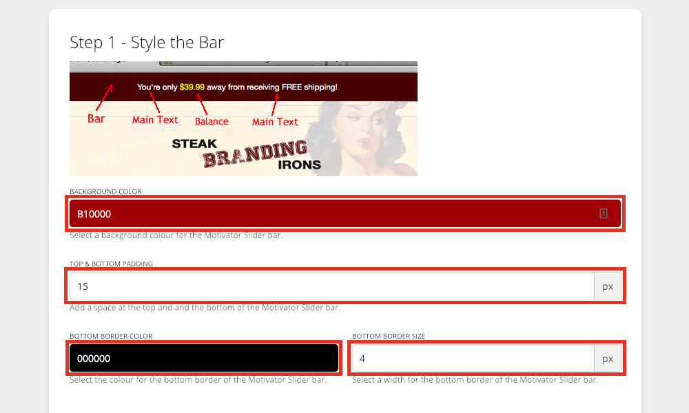 SC Sales Motivator allows you to customize the banner's storefront display. You're able to adjust the colours, font size, and timing of the Motivator bar. You can also use your own custom CSS styling to further style the app.