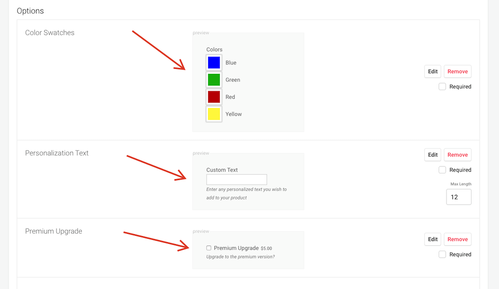 Your customers can select from a group of colour swatches, add personalized text, and upgrade to a premium version of Products A, B, and C.
