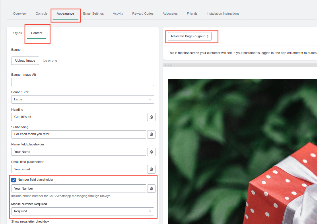 On step 4, Appearance, go to the preview of the campaign. Click Content. Click the checkbox titled "Number field placeholder" to enable this feature. Lastly, click whether you would like this to be required or not.
