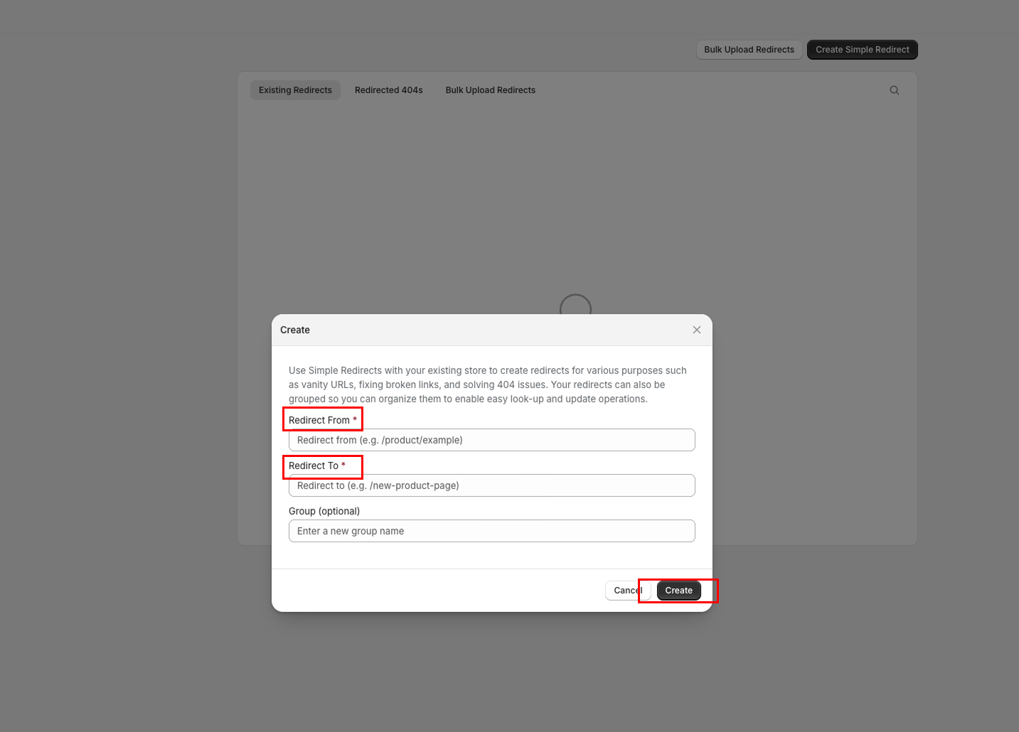 5. In the Create modal, enter the URL you want to move away from in the Redirect From field, enter the new destination URL in the Redirect To field, and click Create to save your changes.