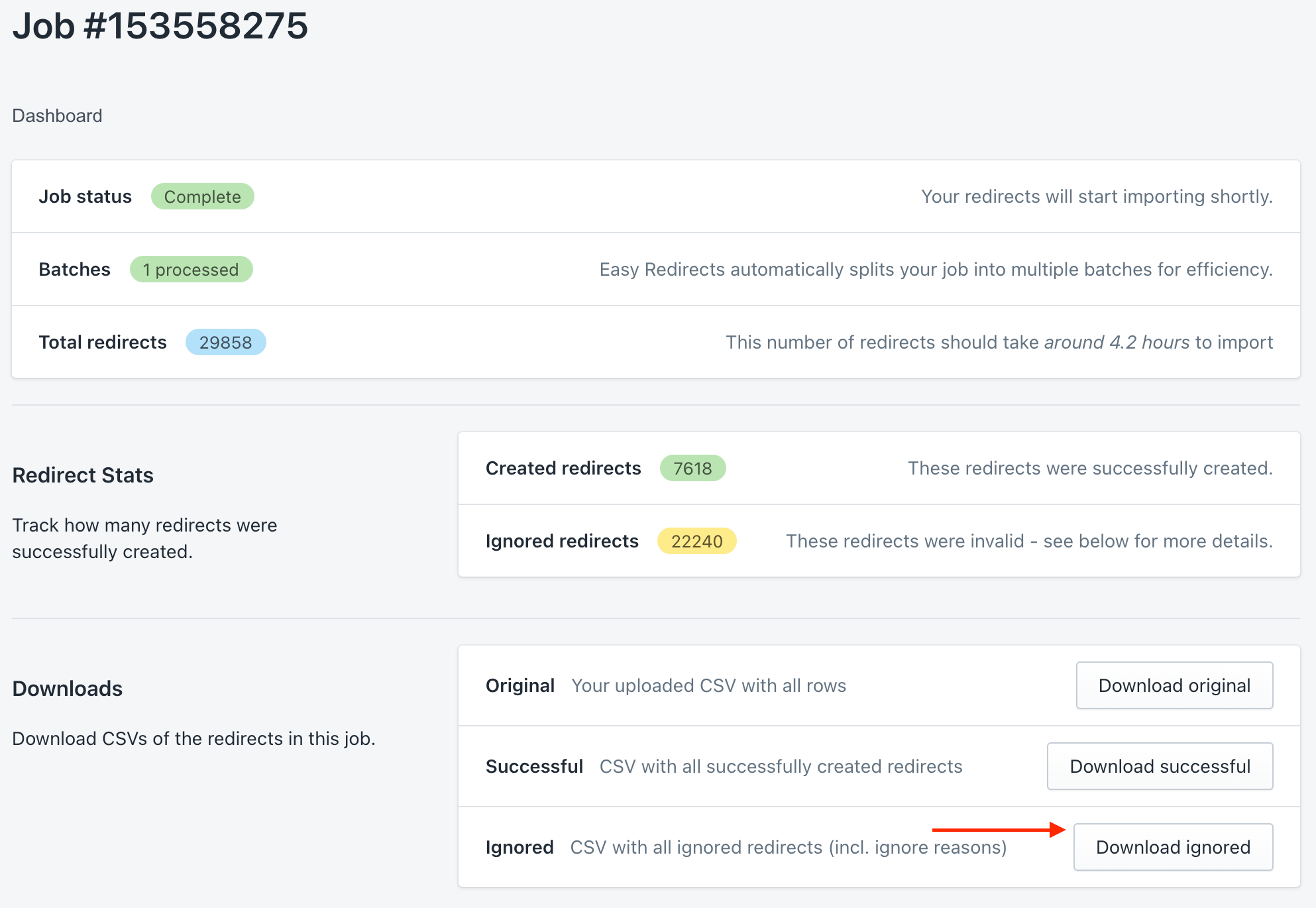 Once the import is done, click on the import job on the dashboard to view the details. If you have any ignored redirects, the app failed to import these ones. Click ‘download ignored’ to see a spreadsheet showing the redirects that were ignored and the reasons why.