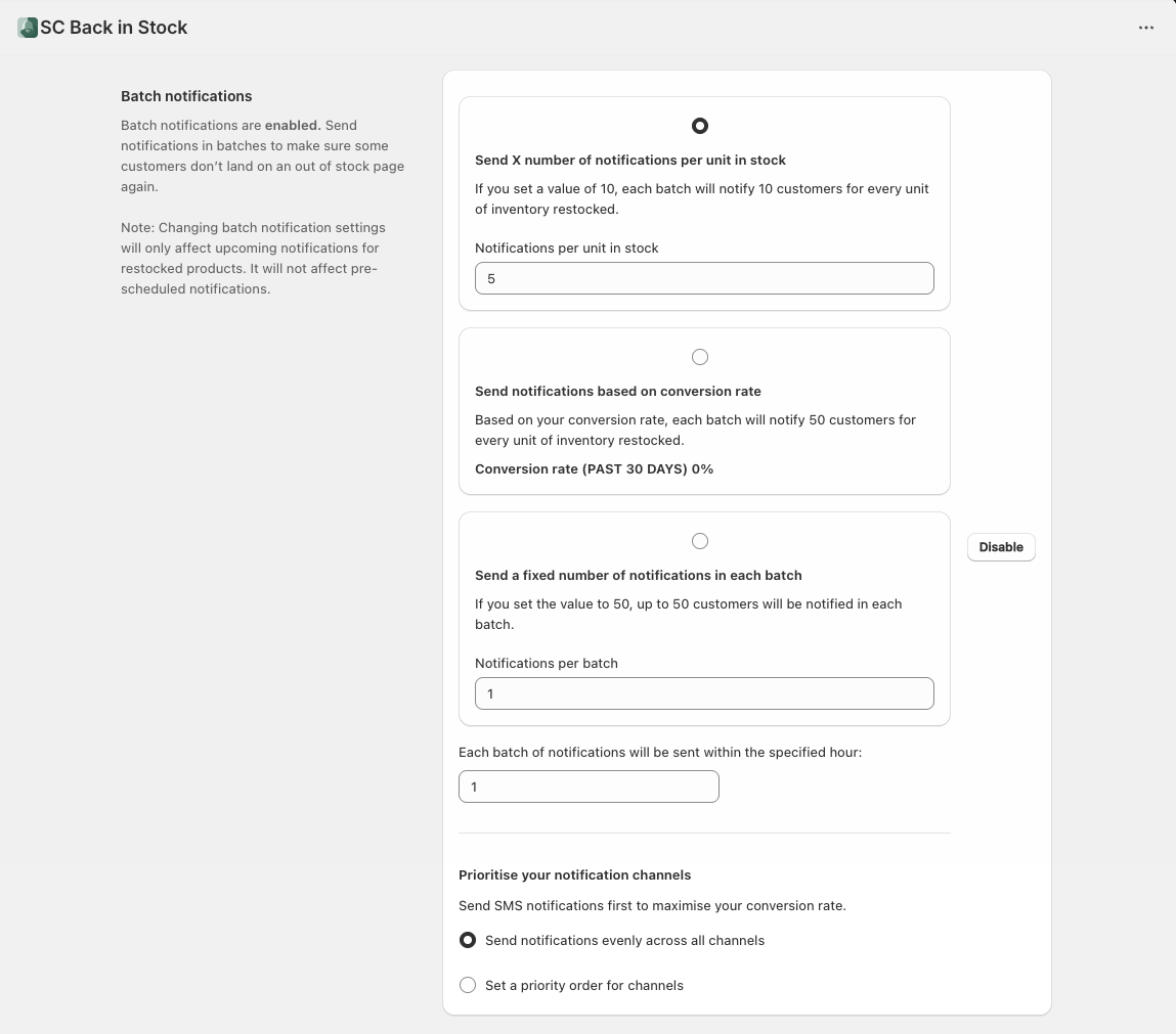 You'll have to wait for this feature to get more data as this is a new feature. Once it has enough data you can select this option. After that, if your conversion rate is 20% and you restock 20 units, the app will alert 100 subscribers.