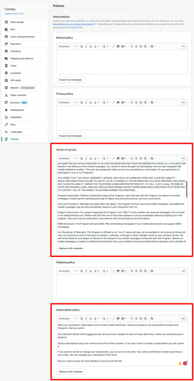 Footer text is accessible by visiting the Settings link on the bottom left-hand corner of your Shopify admin. Then click on Policies at the bottom of the Settings menu. From there, you can edit the Terms of Service and Subscription Policy sections (if your store utilizes subscriptions). Once your users click the links in the footer, your policies will appear in a pop-up box.