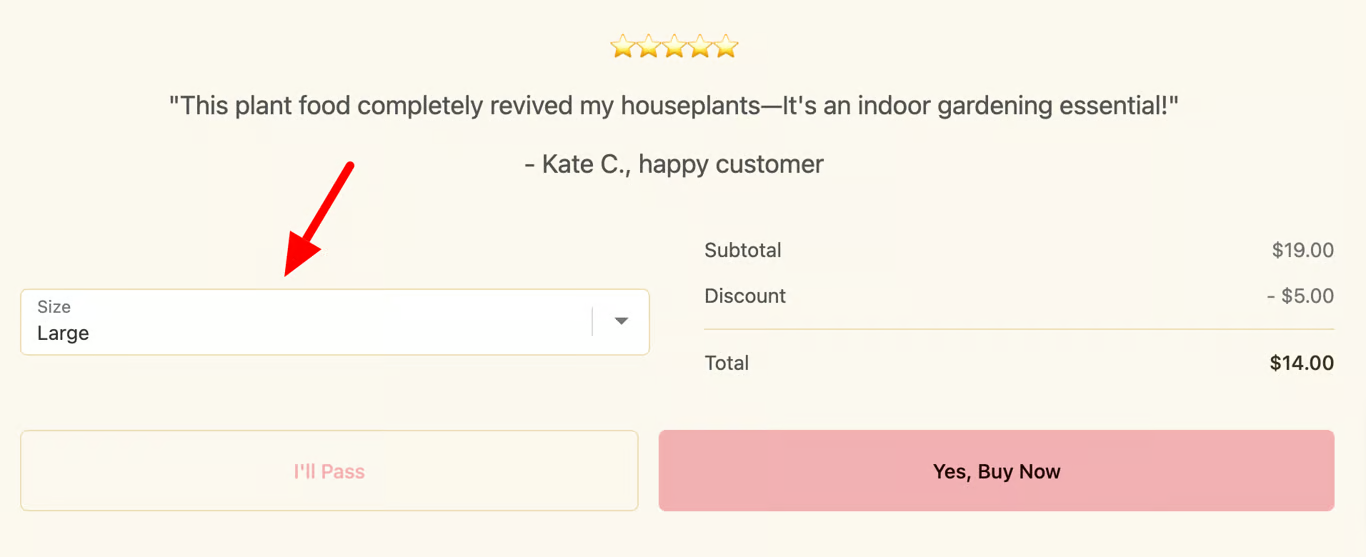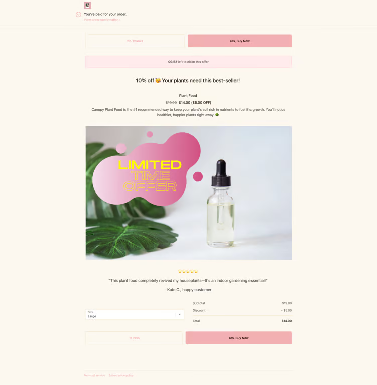 Our post-purchase offer pages will inherit your store's checkout style, colors, fonts, and more, which can be customized from the theme's settings.