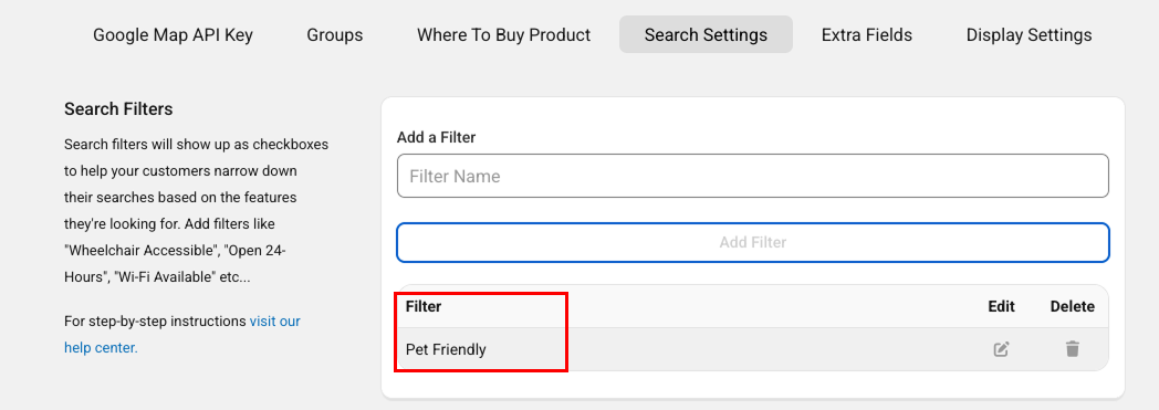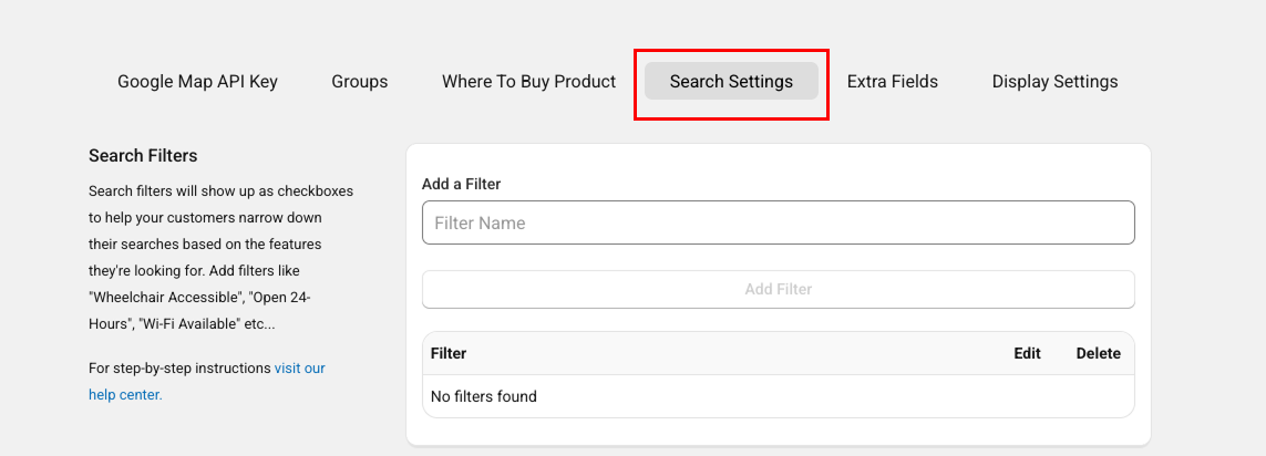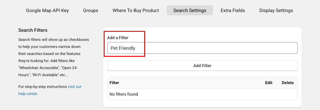 Store Locator allows you to create search filters to help your customers narrow down their searches.