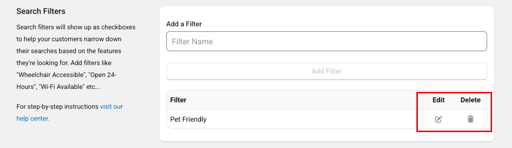 1. Added the Pet Friendly search filter following steps in the Adding Search Filters section.