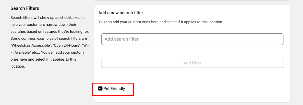 2. Click on the checkbox for the filter you want to relate to a specific location (in this case, click the checkbox for "Pet Friendly").