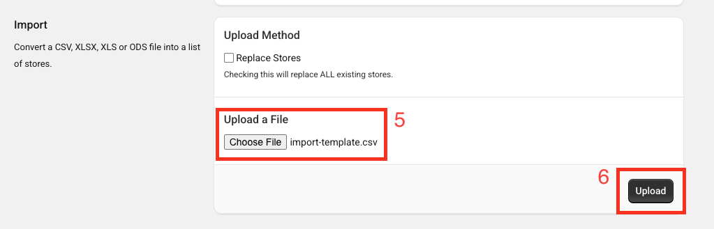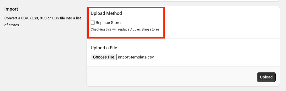 Additionally, If you want to remove all existing locations, during importing the new ones, opt in for Replace Stores option. Be aware that this will not save the existing locations export.