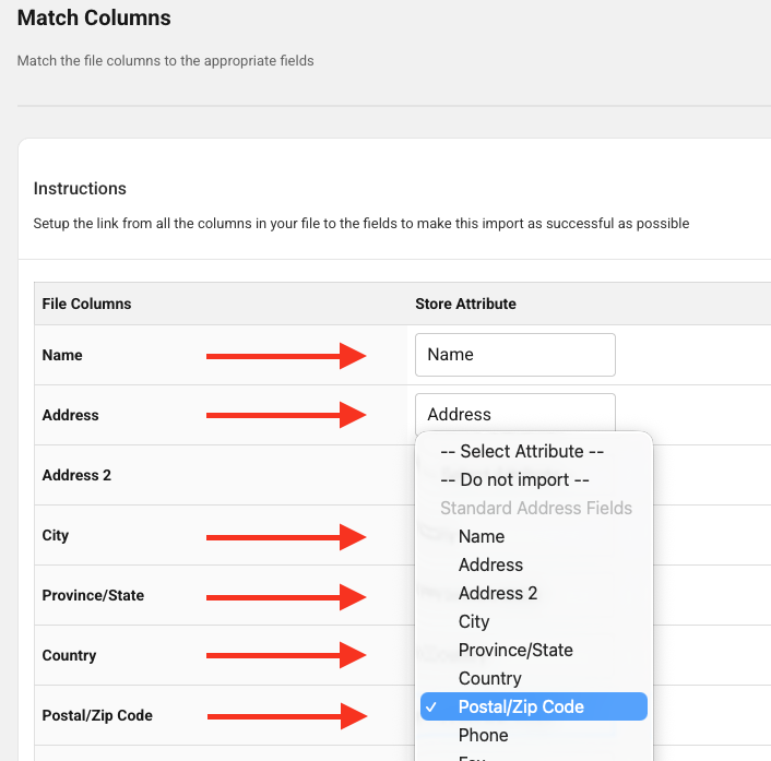 8. Match Columns by relating columns names from the imported file and standardized fields used within SC Store Locator.