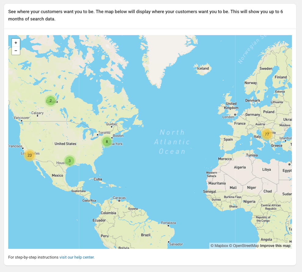 As you continue zooming, you will see a more detailed map, showing the locations where people have searched for your store using a postal/zip code.