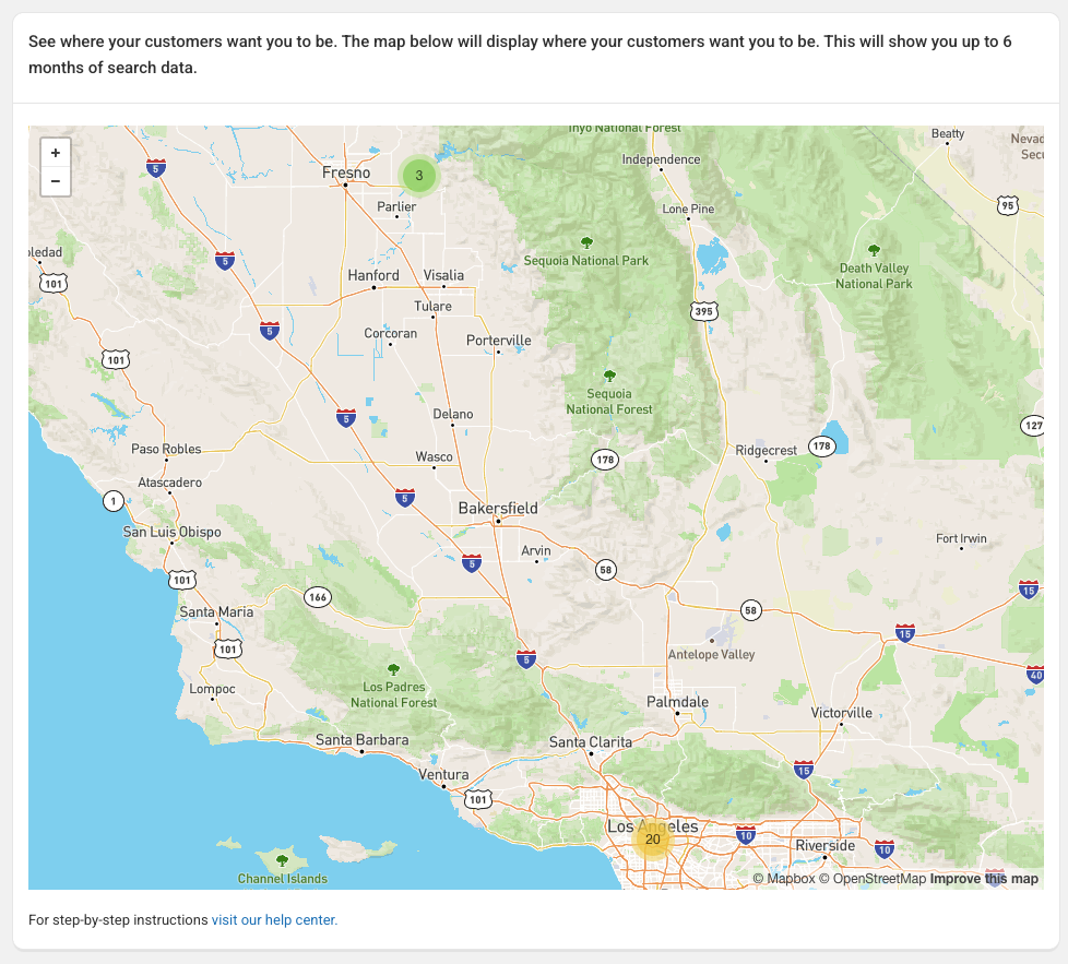 The Customer Lookup allows you to see what your customers are searching for. A pin will appear for each search for the previous 6 months.