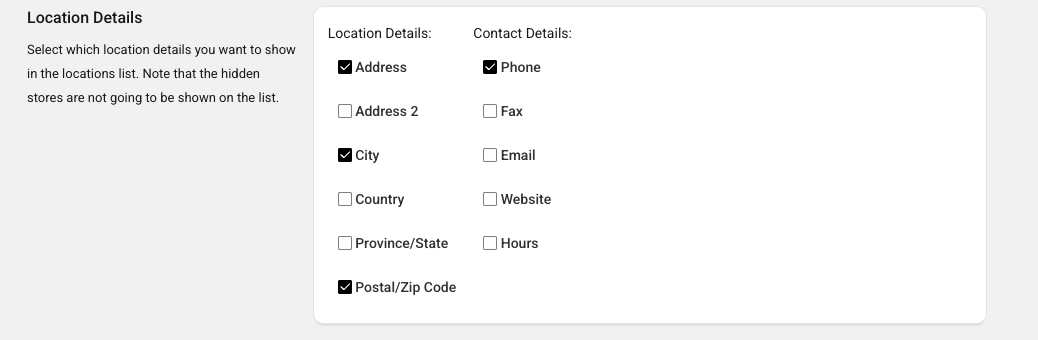 4. Under Location Details, check the boxes for the information you want to display (e.g., Address, Phone Number, or Opening Hours).
