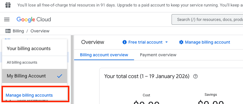 - If you already have a billing account, select Manage billing accounts and follow the next steps.