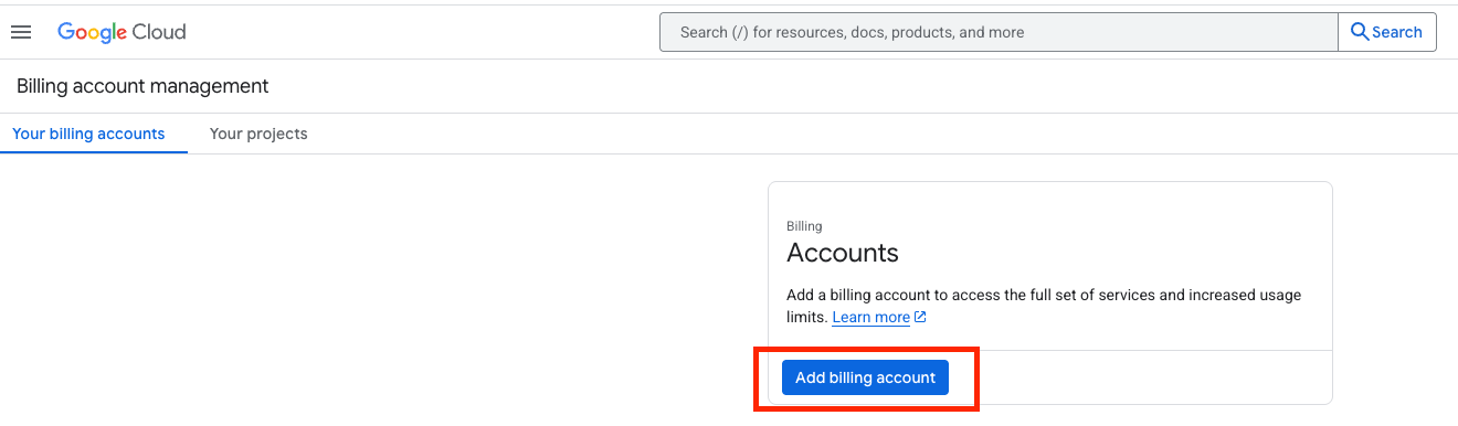 - If this is your first billing account, select Add billing account and follow the next steps.