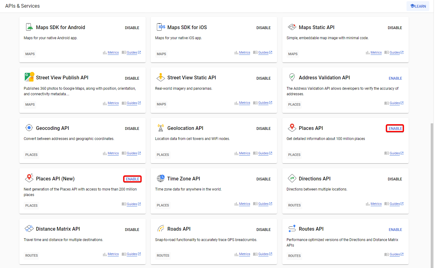 3. From the list of APIs on the Dashboard, look for Places API and Places API (New).