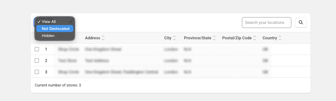 4. At the top of the page, click the Filter dropdown and select Not Geolocated. This will display only the stores that are currently missing from your map.