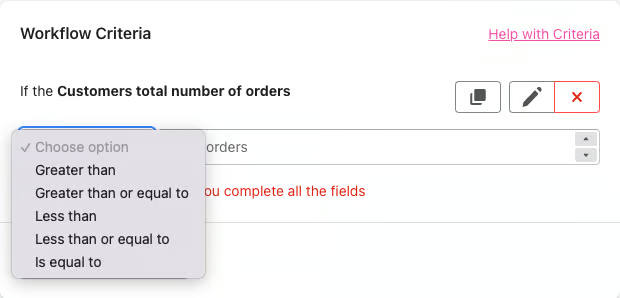 - Customers total number of orders - This criteria uses the current "orders_count" value held for the customer. So while this can be used for live processing of orders to apply a Tag based on this current value, the criteria cannot be used in a backdate to detect the "orders_count" value at the time of the order. Only the current value will be applied