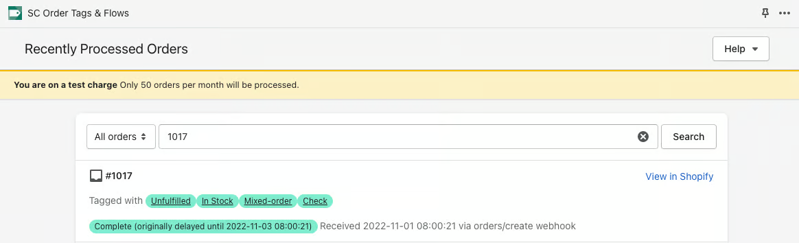 The Recently Processed Orders view within the Order Tagger app is where you can find more details about how Order Tagger has processed an order