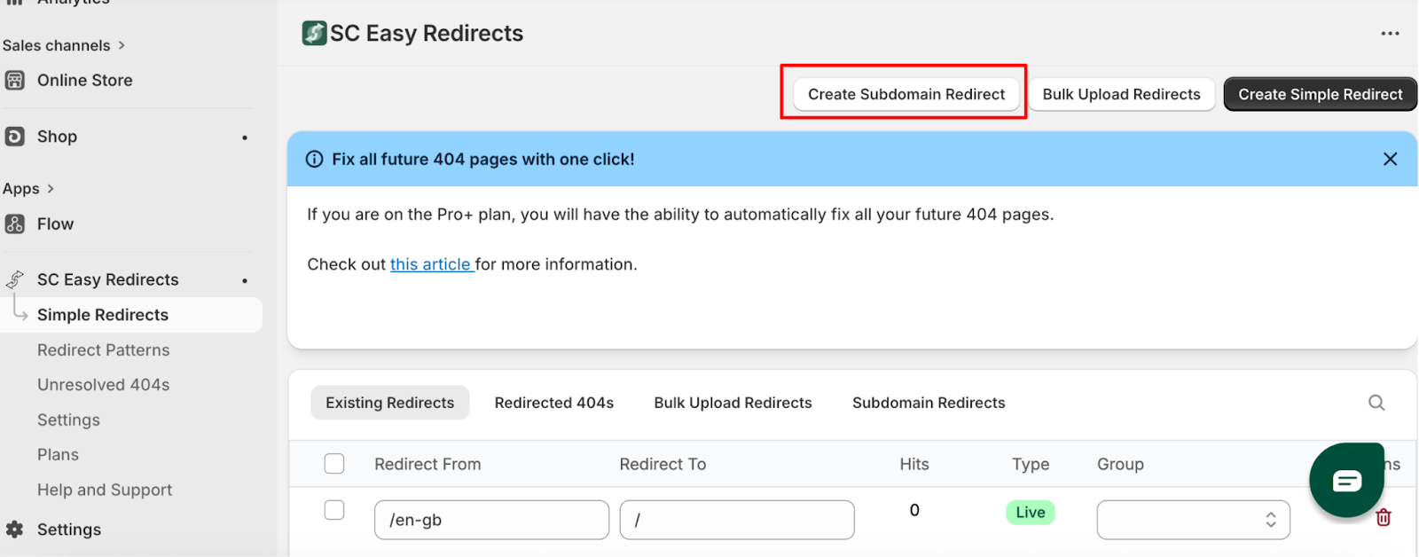 Your new redirect will appear in your Existing Redirects list, (marked as subdomain redirect) where you can monitor hits, edit the destination, or remove it at any time.