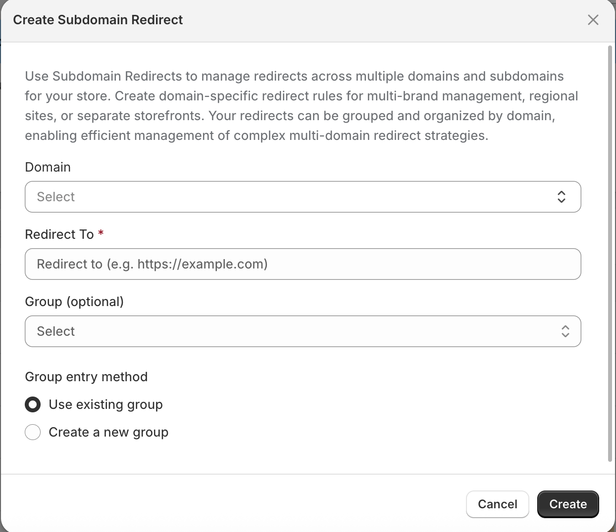 Group (Optional): Assign the redirect to an existing group or create a new one to make it easier to filter or navigate through your redirects.