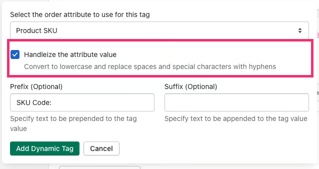 There is an option to handleize the dynamic tag before it gets applied to your order.