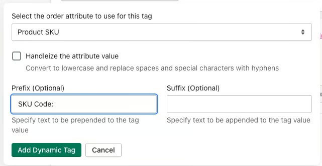 Select this option if you wish the value of your selected order data to be converted to lowercase and to have spaces and special characters replaced with hyphens prior to being applied as a tag to your order: