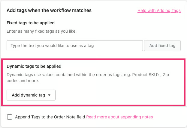 The dynamic tags selector can be found within the Add tags when the workflow matches section of the workflow builder: