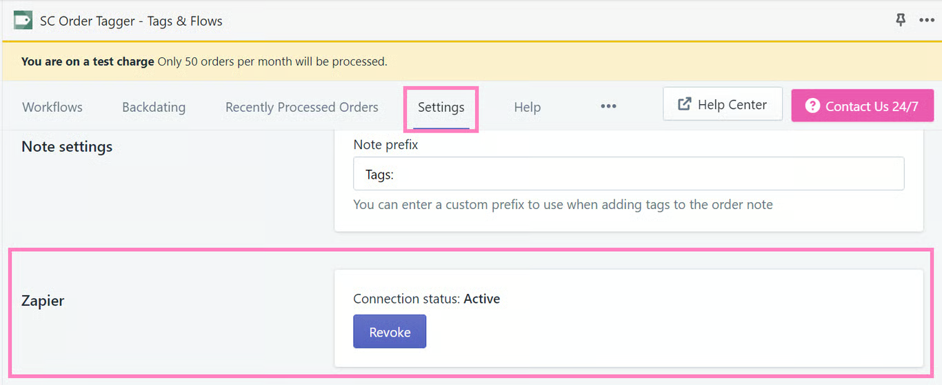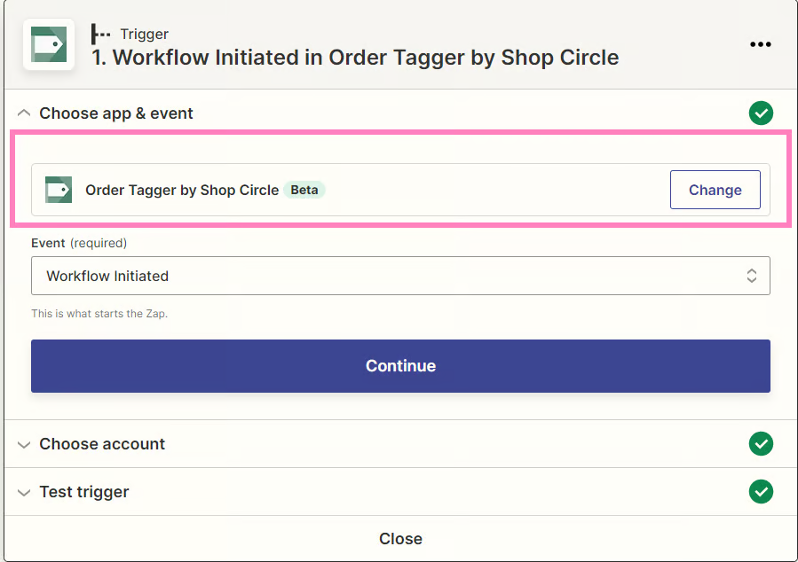 Our Order Tagger trigger in Zapier is "When a workflow is initiated". It triggers when a workflow is started in the Order Tagger app.