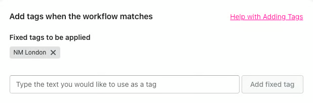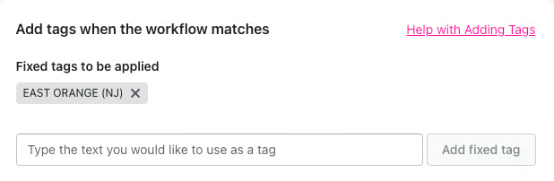 Choose the name of the tag you'd like to see on all orders that match this workflow and enter it into the Add tags when the workflow matches section.