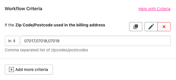 A workflow can be set up within Order Tagger to tag orders based on the Zip Code/Postcode used in the billing address. This criteria will allow you to analyse the order's Billing Zip Code/Postcode to search for a particular string.