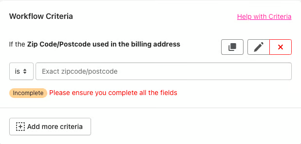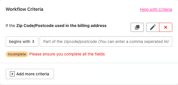 Select a criteria option based on what you are trying to identify from the Zip Code/Postcode.