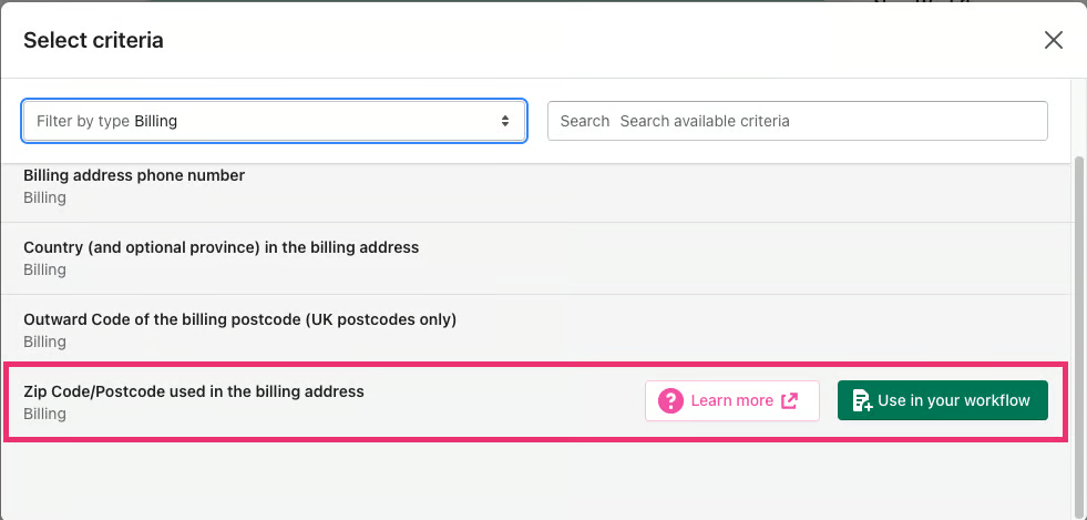 The Zip Code/Postcode used in the billing address criteria can be found within the Billing category in the Select criteria pop-up window: