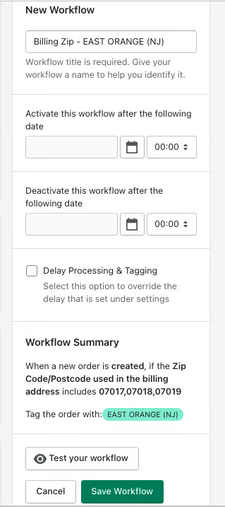 It's worth giving your workflow a name to help you identify it at a later date, so add a workflow name in the New Workflow section, check the summary of your workflow and if happy, either Test your Workflow against an existing order or hit Save Workflow: