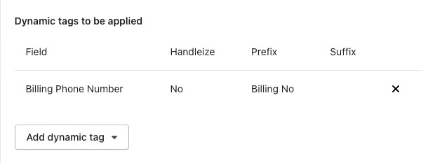 The billing address phone number and shipping address phone number are also available as Dynamic Tagging options within the workflow builder, allowing you to add the billing and shipping address phone numbers as tags to the order automatically.