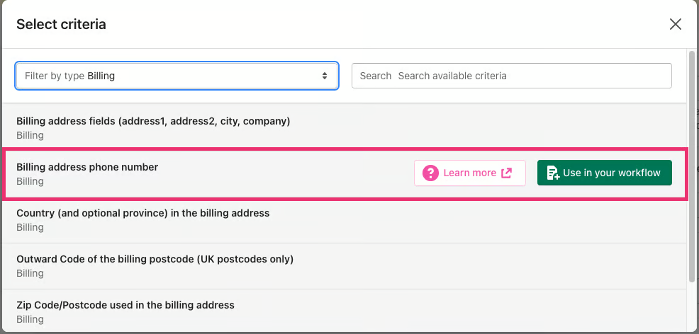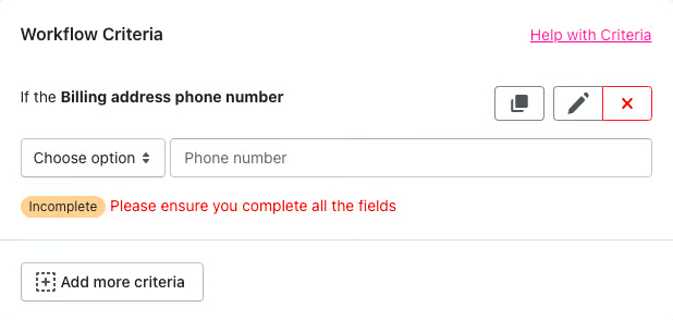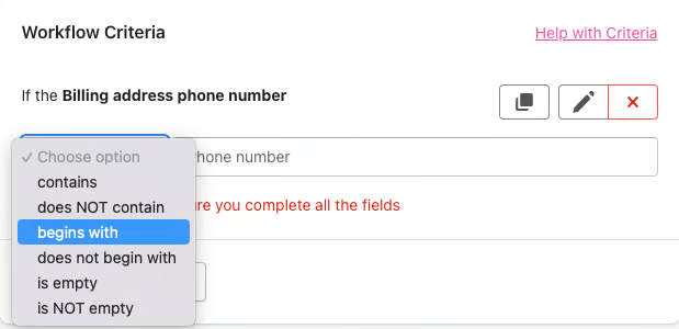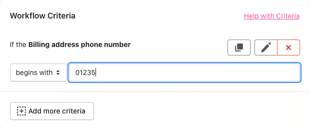 If you'd like to tag orders based on whether the phone number provided as part of the billing details either exists or, contains a particular string of numbers, then our Billing address phone number criteria can do just that.