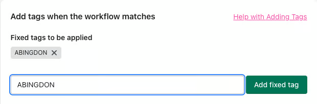 Define the tag name/names that you would like to be applied when this workflow matches your criteria (don't forget to click the Add fixed tag button):