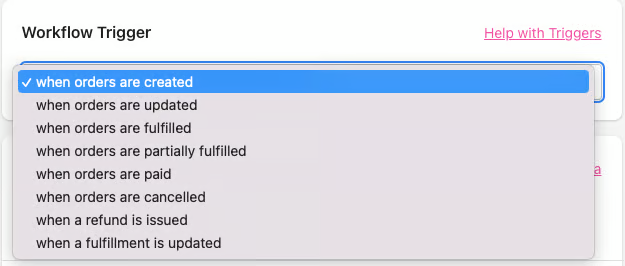 Define the trigger to determine at which point you would like the workflow to run, we recommend selecting the trigger when orders are created.