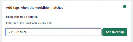 Choose the name of the tag you'd like to see on all orders that match this workflow and enter it into the Add tags when the workflow matches section. In this example we have used the tag VIP Customer: