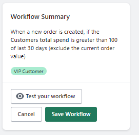 Any new order will now be checked to see if the Customers total spend is Greater than 500 (based on the currency of your store). If the workflow matches, the order will be tagged with VIP Customer.