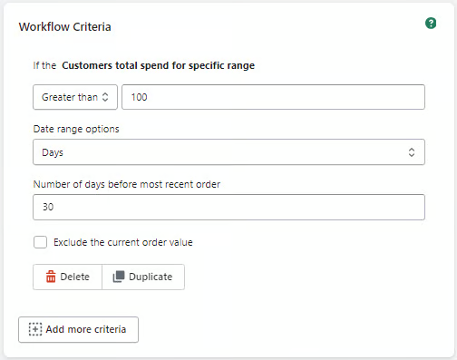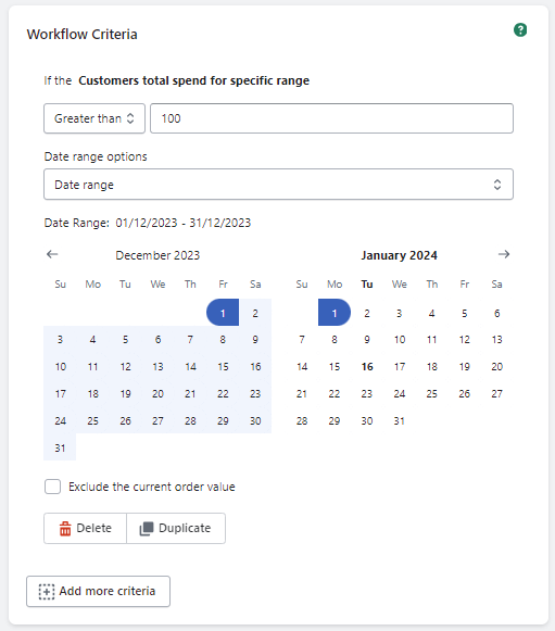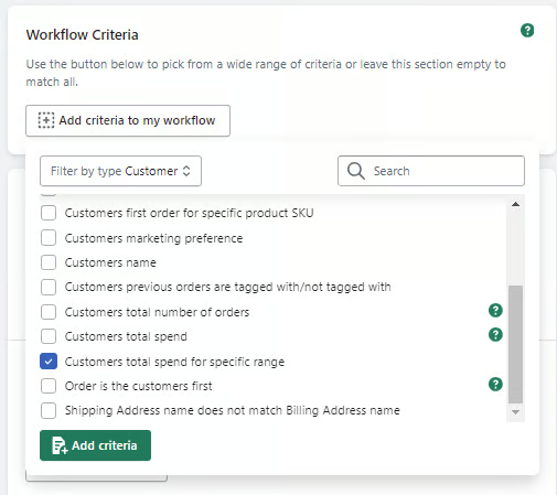 If you'd like to tag orders based on the customers total spend within a specific date range with your store, then our Customers total spend for specific range criteria can do just that.