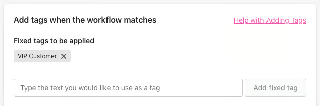 Choose the name of the tag you'd like to see on all orders that match this workflow and enter it into the Add Tags FIXED TAGS TO BE APPLIED section. In this example we have used the tag VIP Customer: